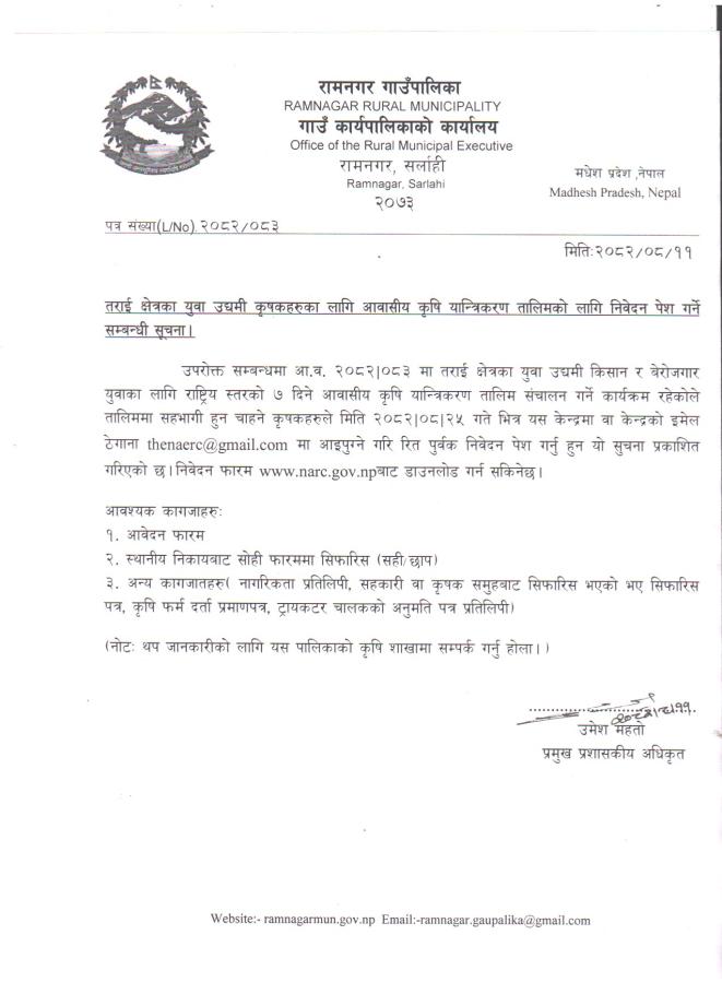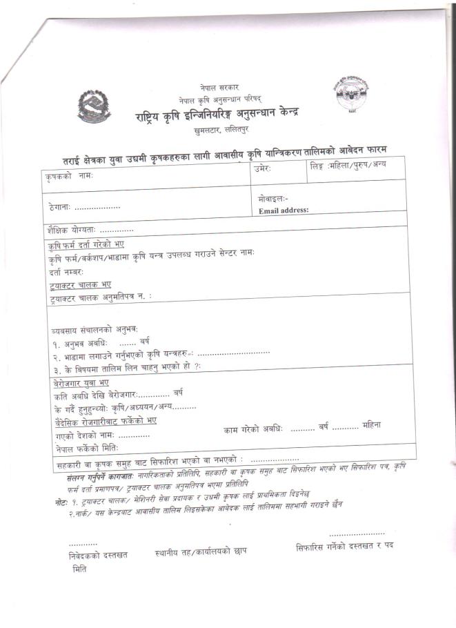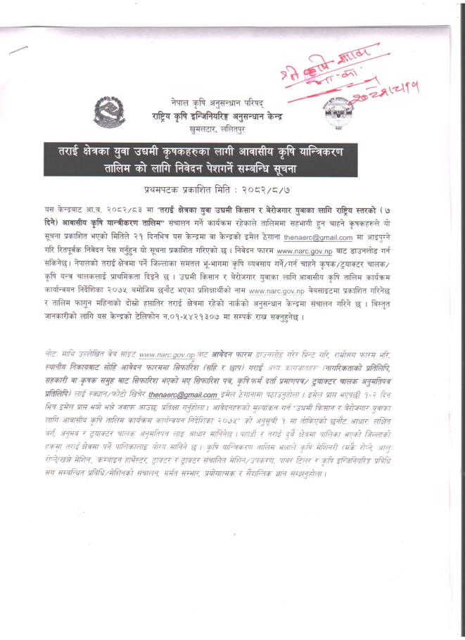 तराई क्षेत्रका युवा उद्यमी कृषकहरुका लागी आवासीय कृषि यान्त्रिकरण तालिमको लागि निवेदन पेश गर्ने सम्बन्धि सूचना